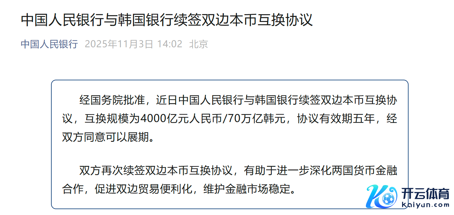 11月3日,据中国东说念主民银行官方裸露,经国务院批准,近日中国东说念主民银行与韩国银行续签双边本币互换左券,互换领域为4000亿元东说念主民币/70万亿韩元,左券灵验期五年,经两边应允不错缓期。