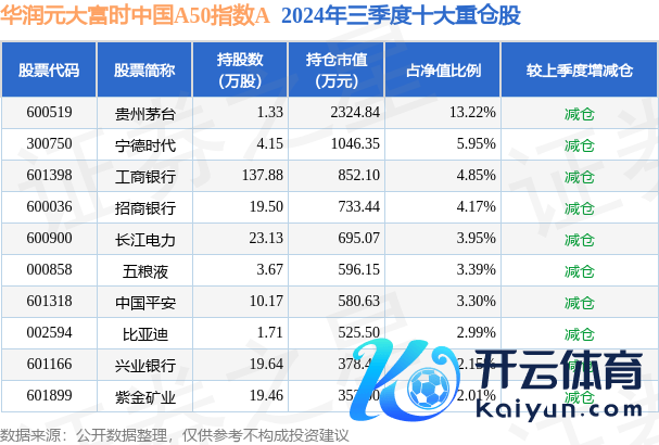 华润元大富时中国A50指数A为指数型-股票基金,凭据最新一期基金季报披露,该基金金钱树立:股票占净值比91.56%,债券占净值比4.44%,现款占净值比6.26%。基金十大重仓股如下: