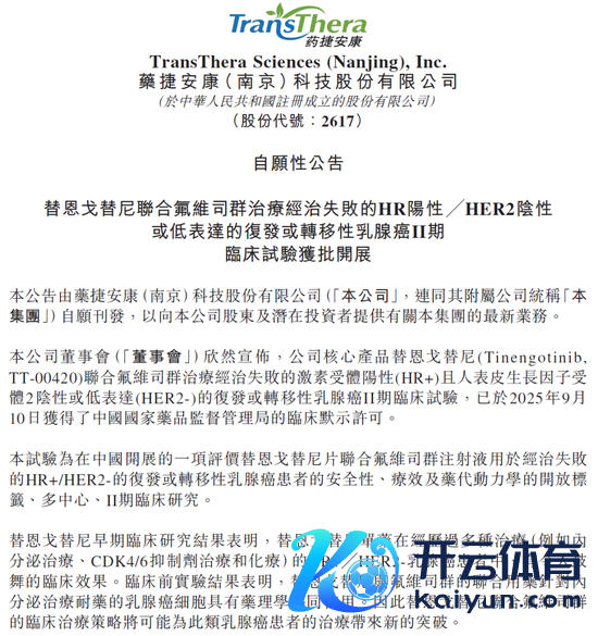 9月10日,药捷安康发布公告称,公司中枢居品替恩戈替尼(TT-00420)都集氟维司群颐养HR+/HER2-复发或革新性乳腺癌的II期临床测验,于2025年9月10日获中国国度药监局默示许可。测验为绽开标签、多中心筹商,旨在评估都集疗法的安全性、疗效及药代能源学。