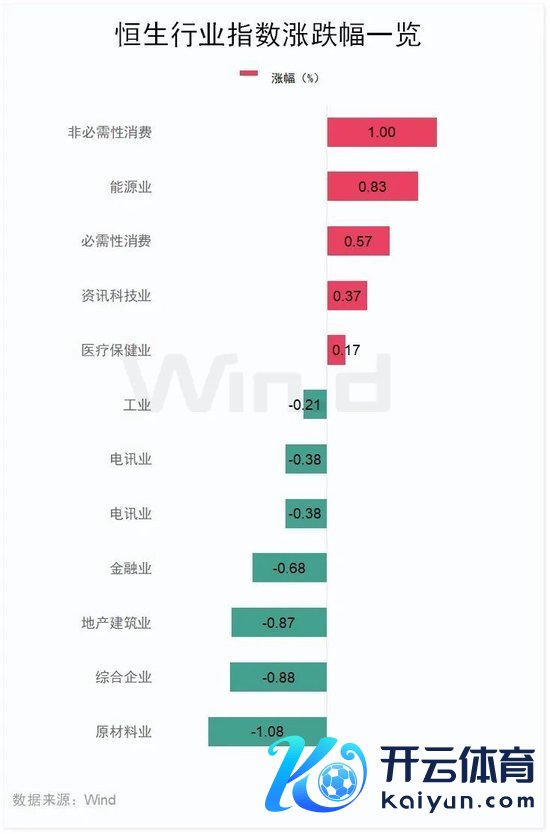 恒生行业指数方面,非必需性消耗行业指数高涨1.00%,能源业指数高涨0.83%,必需性消耗行业指数高涨0.57%。跌幅方面,原材料业指数着落1.08%,概述企业指数着落0.88%。