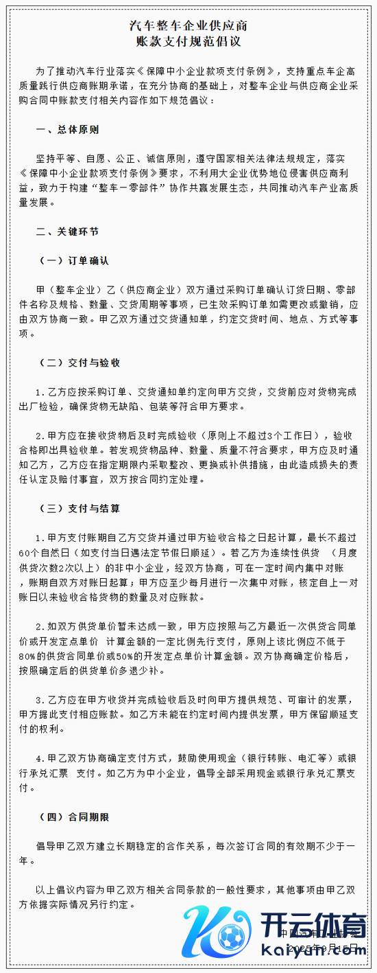 《汽车整车企业供应商账款支付措施倡议》明确了货品请托验收、账期起计、对账结算、款项支付等条目,如,明确货品验收期间原则上不向上3个使命日,账期起算期间原则上为供应商交货并通过验收之日,对中小企业提出一谈经受现款或银行承兑汇票支付,倡导供货两边修复泄漏合作干系、每次条约缔结的灵验期不少于1年。倡议细化了实施条目,有助于引颈行业企业将账期同意落到实处,对促进汽车行业措施发展具有进攻意念念。
